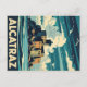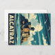 A vintage-style travel poster depicts Alcatraz Island, featuring the former prison building and lighthouse on its rocky outcrop, surrounded by ocean waves and soaring seagulls under a dramatic cloudy sky. "ALCATRAZ" is boldly displayed at the bottom.