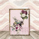 John Tenniel's illustration of the white rabbit in the vintage Alice in Wonderland in the storybook fairytale. He wears heart card clothing, teal collar, blowing a trumpet and holding a scroll with green gem. Burgundy and white floral roses at top right. Pink heart background, glitter pink lace at bottom, and antique gold border.