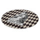 Vintage Alice in Wonderland illustration is Alice putting on a crown. Background is textured charcoal and ivory harlequin pattern. Personalise text