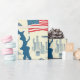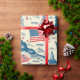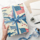 A beautifully crafted vintage-inspired pattern featuring iconic American landmarks and symbols. With the Statue of Liberty, USA map, mountain ranges, and USA flags all set against a rustic background, this wrapping paper celebrates the spirit of the United States through timeless and recognisable imagery. Perfect for adding a nostalgic and patriotic flair during national holidays or year-round.