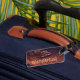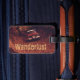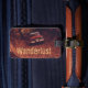 Vintage, nostalgic image of a retro american car driving through fall colors on a narrow country road with "Wanderlust" text.