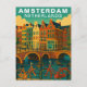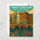 Capture the vibrant and cozy spirit of the Dutch capital with this beautiful Amsterdam, Netherlands Travel Card. This vintage-style illustration features a row of iconic, multi-colored gabled houses reflecting in the serene waters of a city canal.
