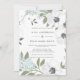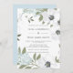 A sophisticated modern wedding invitation with a vintage feel. This design a watercolor floral surrounding frame with a mix of bold and delicate white flowers, and green leaves on a white background. Your details are in modern dark grey font, and the reverse is in solid light blue.