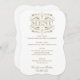 Elegant and formal wedding dinner menu cards feature decorative swirls and flourishes that frame the vintage inspired design. White and antique gold colours. Personalise with the bride and groom names, event date, and menu details.