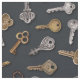 This fabric has hand-illustrated vintage and antique keys for safes and locks on a dark blue background.