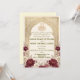 Celebrate your union with timeless elegance. This formal Nikah design features deep marsala blooms, vintage parchment, and traditional Islamic geometry.This design presents a sophisticated composition anchored by a central geometric arch featuring an intricate arabesque lattice pattern in a printed faux gold hue. The visual hierarchy begins with the Arabic "Bismillah" calligraphy at the apex, gracefully flowing into the formal English typography below. The arch is framed by lush watercolor botanical clusters, highlighting deep burgundy and marsala roses paired with dusty pink peonies and cream accents against a textured, aged parchment background. The typography combines a traditional serif font for body text with an elegant script for names, creating a balanced, high-end editorial look.This is a flat printed image with a faux gold foil and parchment texture effect, not actual raised material or metallic foil.