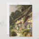 Vintage illustration architectural image featuring a classic English country cottage house with a thatched roof and lovely English gardens and a woman standing by the front steps. Could be a beautiful country bed and breakfast inn.
