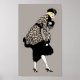 Vintage illustration art deco design featuring an elegant and sophisticated blonde lady dressed in a fake leopard animal print faux fur coat and matching hat.