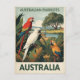 A colourful, vintage-style travel poster featuring an artistic illustration of Australian wildlife in a lush landscape. The design showcases several native parrots and a cockatoo perched amongst tropical foliage, with a peaceful scene of a person by a waterhole in the background. This retro-inspired artwork is perfect wall décor for travel enthusiasts, bird lovers, fans of Australian nature, and those who appreciate the bold aesthetics of mid-century modern or wildlife prints.