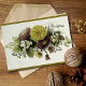 Card features a beautiful vintage illustration of a chrysanthemum floral spray in autumn colours. The mauve and gold mums are complimented by an array of creamy white berries and varying shades of green foliage.
