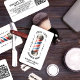 Revitalise your branding with our vintage barber shop business cards! Featuring a retro watercolor painted barber pole in iconic red, white, and blue, these cards boast a unique text setup in a double arch formation surrounding the pole. The classic retro typography adds a touch of timeless charm to your branding. Cool, trendy, and utterly unique, these cards are perfect for barbers and stylists looking to make a statement. Order now and elevate your barber shop's image with a touch of vintage flair!