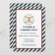 Vintage baseball with navy blue stripes and red accents. Birthday or party invitation. Any age on ball.