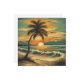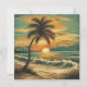 This is an image depicting a vintage idyllic outdoor scene. The dominant foreground colour is yellow, and the dominant background colour is brown, contributing to an overall warm colour palette. The image represents a beach setting with a palm tree as its main focus. The sky above the beach is filled with clouds, creating a serene landscape. The image also includes a sunset, giving a sense of time.