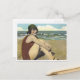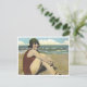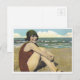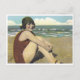 Vintage postcard reproduction with a cute 1920s flapper style girl in bathing suit sitting on the beach with a big smile. Unknown beach, but with vintage Florida travel style with retro colour printing look.