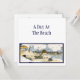 A custom invitation with a vintage illustration from a storybook of a child laying on the sand at the beach. His dog swims far out in the waves.