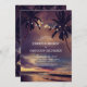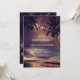 Romantic vintage beach sunset engagement party invitation with purple palms and string lights.