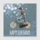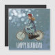 Vintage bicycle girl - she is wearing a red cap and blue dress . Antique graphic image with great details . It comes with blue bokeh background and the words "Happy Birthday " in white fonts .
