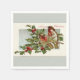 Two beautiful red and brown birds are sitting side-by-side on a branch of holly and berries covered lightly in snow. Greeting: A Merry Christmas. Image from a Vintage Christmas Postcard with a custom grayish green border.