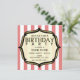 A vintage circus inspired birthday party invitation featuring a background of faded red and white stripes on front and back. front features decorative golden bracket frame outlined in black. Customise with details of your occasion.