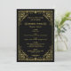 Elegant and glamourous art deco wedding dinner menu inspired by ornate vintage Gatsby style and the roaring 20s. Card design features a black and gold colour scheme, ornate decorative frame, custom monogram and menu text, and a graphic pattern on the back side.