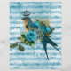 Unique design features vintage songbird illustration with crown and floral elements on a waterstained blue tint sheet music background