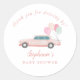 Cute drive by baby shower favour sticker featuring a vintage pink car with balloons. The text says "thank you for driving by!" Perfect for a curbside celebration during this quarantine period.