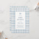 This invitation features a clean, understated design with a soft blue gingham pattern background that gives it a classic, tailored look. A centred white card with a thin border creates a structured layout, while the mix of serif and script typography adds a touch of elegance without feeling formal. The muted blue colour palette and simple wooden blocks toy icon lend a calm, traditional feel, resulting in a style that is refined, vintage and quietly sophisticated.