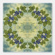 A soft, elegant botanical wallpaper featuring a hand-painted watercolor blueberry branch arranged in an oval wreath design. Deep blue berries, lush green leaves, and delicate white blossoms frame a calm, textured background in gentle blue-green and warm yellow tones.