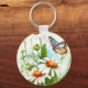 Vintage flowers and butterflies monogrammed keychain- Girly floral, vintage illustration of blue butterfly among a field of wild daisy flowers. Watercolor style floral art. Monogrammed name in elegant script, green lettering with shadow look. Nice gift for teen girl just getting her drivers license.