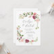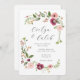 Wedding invitation featuring an elegant border of bohemian inspired flowers with poppies and burgundy and mauve flowers. Customise with your information.
