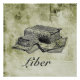 Vintage book illustration on distressed background with text "Liber" (Latin - books)