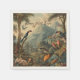 vintage painting of a botanical scene with toucans and butterflies flying around. Palm trees on the sides with a mountain in the background. Tropical flowers on the front