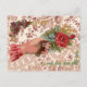 Lovely vintage painting with a lady's hand holding and offering a flowers bouquet with a beautiful red rose and rose bud, pretty blue flowers, forget me not flowers, grasses, and green leaves with red flowers and blue flowers and pink lace.