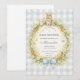 A charming vintage baby shower design featuring a sweet watercolor bunny resting above a delicate spring garden wreath. Soft daisies, greenery, and tiny carrots form a whimsical botanical frame, finished with a gentle ribbon bow and a soft blue gingham background. The storybook illustration style and pastel countryside palette create a timeless cottagecore aesthetic that feels warm, playful, and perfect for celebrating a new little arrival.