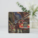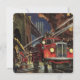 Vintage illustration business occupation design featuring emergency personnel, firemen working to put out a blazing fire in a burning building in the darkness of night in an urban city under a towering bridge. The brave men and women firefighters are holding hoses with water from their fire trucks.