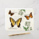 This scrapbook paper features three common butterflies: the Eastern Tiger Swallowtail, the Painted Lady and the Monarch arranged on a page like specimens with scientific name labels. Includes French script and white wildflowers.