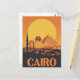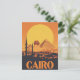 This vintage-style card showcases a striking illustration of the Cairo skyline at sunset. It beautifully combines the ancient wonders of the Pyramids and the Sphinx with the modern cityscape and its minarets. The bold, sun-drenched colour palette and retro typography give it a classic, timeless feel, making it an ideal card for a traveller or a lover of history and world culture.