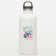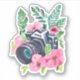 Pink flowers, green foliage and vintage camera stickers.