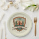 These personalised paper plates feature a scout-style badge with a cosy tent among tall pine trees. The shield-shaped badge showcases a customised name banner. With earthy retro hues,  this adventure-ready design is perfect for kids' camping trips, birthdays, or summer camp keepsakes.