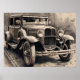 This vintage car sketch captures the essence of classic automotive design with its sleek lines and elegant curves. The car is rendered in black and white, giving it a timeless quality that evokes a sense of nostalgia and sophistication. The attention to detail is exquisite, from the intricate grille and headlight design to the fine detailing on the wheel spokes. The car sits low to the ground, conveying a sense of speed and power, and the proportions are perfectly balanced, creating a harmonious and pleasing overall aesthetic. This sketch is perfect for anyone who appreciates the beauty and craftsmanship of classic cars and would make a stunning addition to any home or office decor.