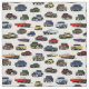 Fabric for anyone who loves old cars; it features a random pattern of illustrations of vintage automobiles from the 20th century.