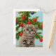 Postcard featuring a vintage cat and Christmas tree! A fluffy grey kitten adorably sits in front of a green Christmas tree. The tree is decorated in red and blue ornaments. A cosy gift for the Christmas season and cat lovers!