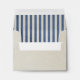This vintage style, charming design features an aged, textured, and distressed pale cream outside, while the inside is of vertical navy blue and cream stripes, giving the envelope a fanciful, stylish feel. The front has a ticket-like outline framing your name(s) and return address so guests can mail the RSVP back to you. This envelope was designed for a matching wedding invitation response card.