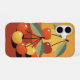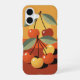 Retro illustration depicting stylized cherries with delicate leaves in a warm palette.