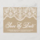 Elegant save the date card featuring whimsical typography and floral lace on faux craft paper background. Other colours and similar items area available. This is a part of a wedding suite.