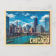 A stunning vintage-style postcard showcasing the iconic Chicago skyline, with its striking skyscrapers towering over the Chicago River. The vibrant, classic colours and retro filter give this image an authentic vintage travel poster feel, evoking the city's rich history and architectural beauty. This card is perfect for sending a thoughtful message, commemorating a trip to the Windy City, or framing as a small piece of city art. A great design for anyone who loves Illinois, city views, or classic American cityscape designs.