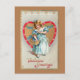 Pretty Victorian girl in pastel blue dress scattering blue forget-me-nots with red-trimmed gold heart and Valentine greeting on grey background.