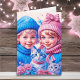 Pretty watercolor Christmas holiday card. Two cute vintage kids, a boy and girl, brother and sister holding kittens in blue and pink winter hats.