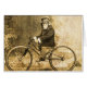 Vintage photo of a circus chimpanzee, wearing a hat and suit, while riding a bicycle.