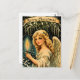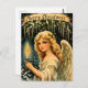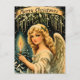 This vintage Christmas postcard features a serene angel holding a lit candle in her right hand. She has flowing golden curls, and her peaceful expression is illuminated by the candlelight. The angel is dressed in a white robe with soft, feathery wings, standing against a backdrop of snow-covered evergreen trees and icicles hanging from branches. Above the angel, the phrase "Merry Christmas" is written in bold, elegant lettering on a golden banner. The overall scene conveys warmth, peace, and a classic holiday spirit with its detailed artwork and wintry setting.